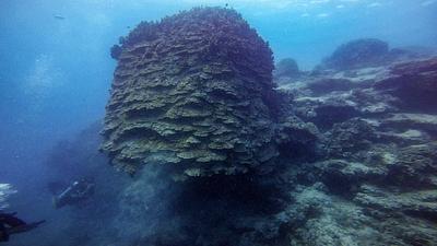 A beautiful coral formation, in the lagoon, very impressive by its size and depth since it goes down to more than 25m and allows multilevel dives. The dive consists of a loop in a forest of turbinaria, these large cone-shaped coral scattered on the slops.